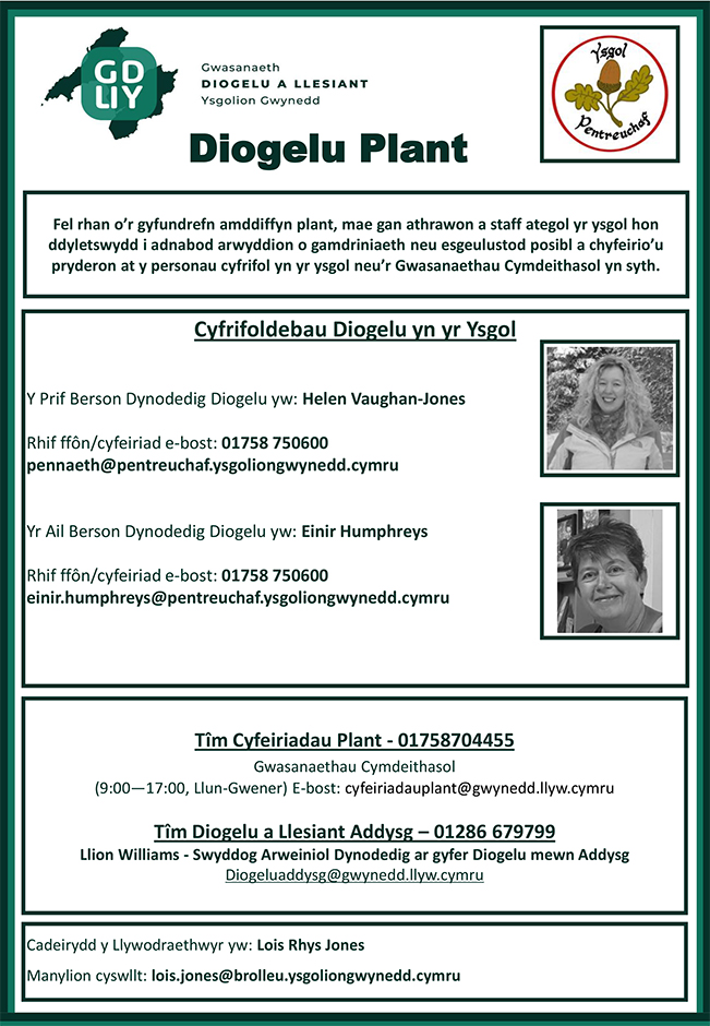 Mae pob aelod o staff yr ysgol hon yn gyfrifol am ddiogelu ac amddiffyn y plant sy’n ei mynychu. Os ceir pryderon ynglŷn ag esgeulustra neu gam-drin corfforol, emosiynol neu rywiol, yn mae’n ddyletswydd ar y staff, yn unol â Threfn Diogelu Plant y Sir, i sôn am y mater wrth Berson Dynodedig Diogelu yr Ysgol.